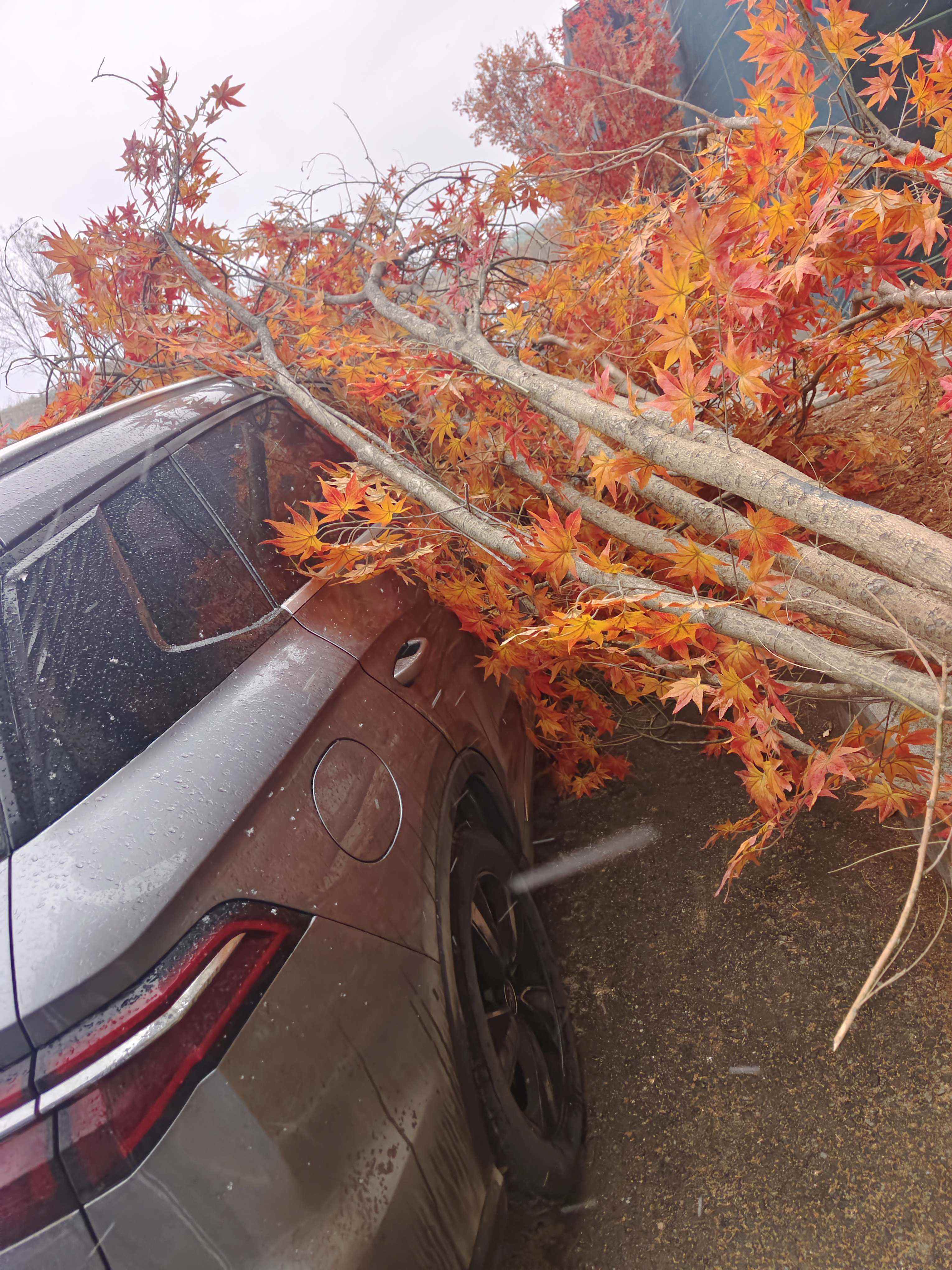 “车就停在马路边,可能因为风大,新栽不久的树整棵直接倒下来,压在车辆A柱上。”周先生向记者描述了当时看到的情景。事发三个多小时后,倾倒的树木被扶正,也做了现场清理。